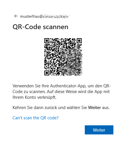 Scannen Sie den QR-Code mit Ihrer 2FA-App und klicken dann auf "Weiter":