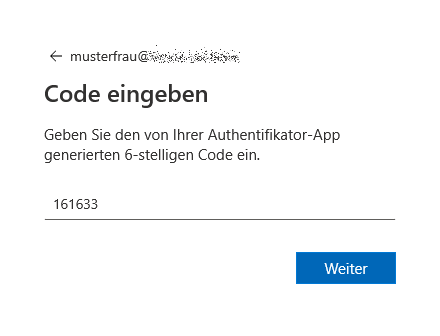 Geben Sie den Code ein der in der App für Ihre Email-Adresse und "Microsoft" angezeigt wird und klicken danach auf "Weiter":