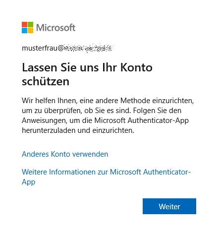 Sie müssen Ihren Account mir einem 2. Faktor (Ihr Handy) oder kurz 2FA schützen. Klicken Sie auf "Weiter":